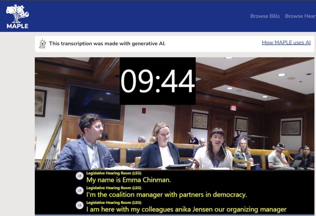In a major leap forward for public understanding of democracy in Massachusetts, transcripts of all state legislative hearings are now accessible for the first time, for free, thanks to a newly-released feature of MAPLE, the Massachusetts Platform for Legislative Engagement. While the Massachusetts legislature’s website offers closed captioning on hearing videos, MAPLE is using generative AI to automatically add time-stamped transcripts to its hearing pages, allowing the transcripts to be read, downloaded and searched.